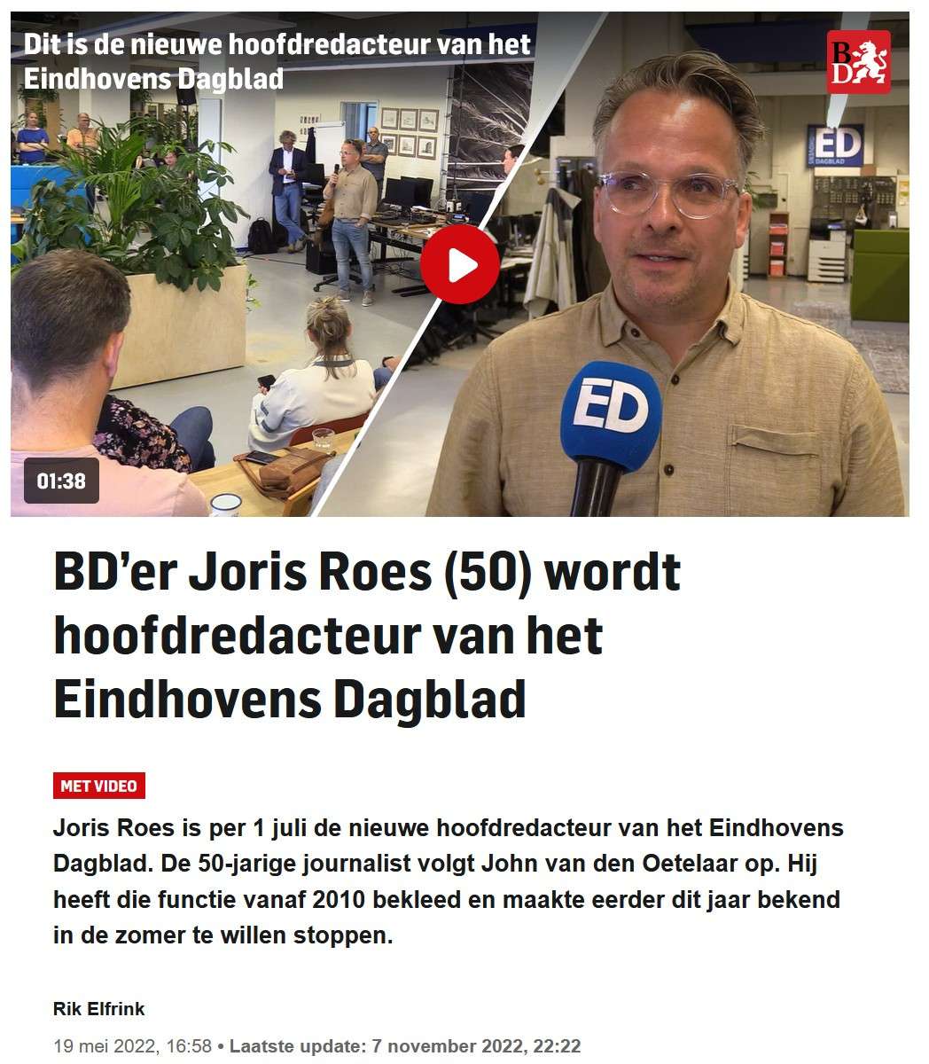Tegenwoordig mag hij hoofdredacteur zijn van het Eindhovens Dagblad. Hij kiest in overleg met zijn redactie, de artikelen voor op de voorpagina en de belangrijke pagina's twee en drie en bijlagen. Twee thema's spelen daarbij een hoofdrol in de krant: ASML en PSV. Joris nam ons mee in de bedrijfsvoering van een krant, het werven van abonnee's en de uitdagingen die spelen met de overgang van offline naar online en de algemene ontlezing van het publiek.